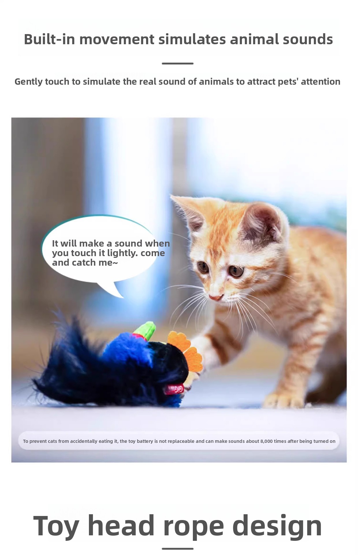 Sound Simulation: Realistic bird and mouse chirping sounds to attract and engage cats.